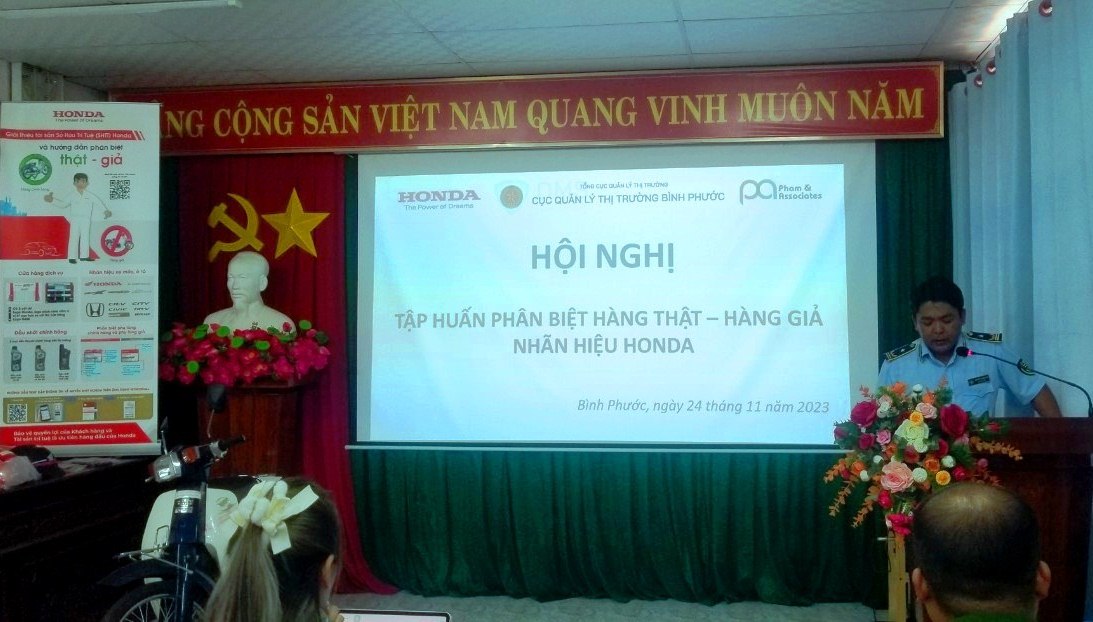 Nhằm nâng cao năng lực thực thi trong công tác đấu tranh phòng, chống hàng giả và bảo vệ quyền sở hữu trí tuệ cho các lực lượng chức năng trên địa bàn tỉnh nói chung và cho công chức thuộc Cục QLTT tỉnh Bình Phước nói riêng. Chiều ngày 24/11/2023, Cục QLTT tỉnh Bình Phước phối hợp với Công ty Honda Việt Nam, Công ty Luật TNHH Phạm và Liên danh tổ chức Hội nghị “Tập huấn phân biệt hàng thật - hàng giả nhãn hiệu Honda”