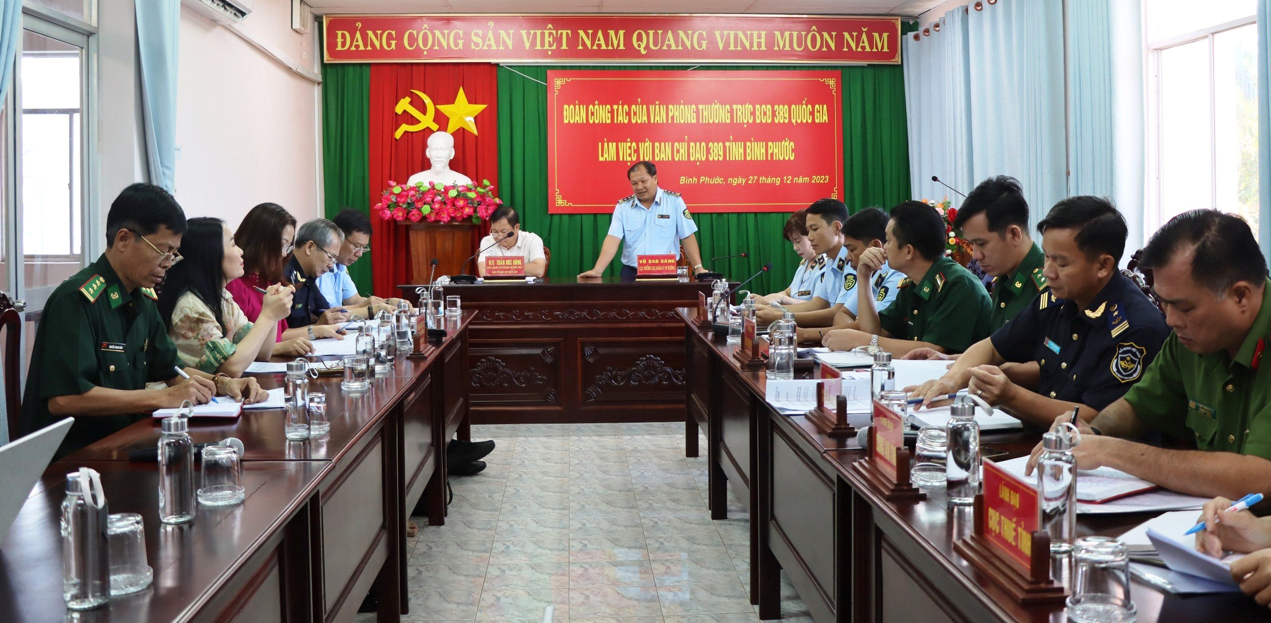 Sáng 27-12, đoàn công tác của Văn phòng thường trực BCĐ 389 Quốc gia do ông Trần Đức Đông - Phó Chánh văn phòng thường trực làm trưởng đoàn đã có buổi làm việc với BCĐ 389 tỉnh Bình Phước để đánh giá kết quả hoạt động chống buôn lậu, gian lận thương mại và hàng giả năm 2023; kế hoạch cao điểm đấu tranh chống buôn lậu, gian lận thương mại và hàng giả dịp trước, trong và sau Tết Nguyên đán Giáp Thìn 2024.