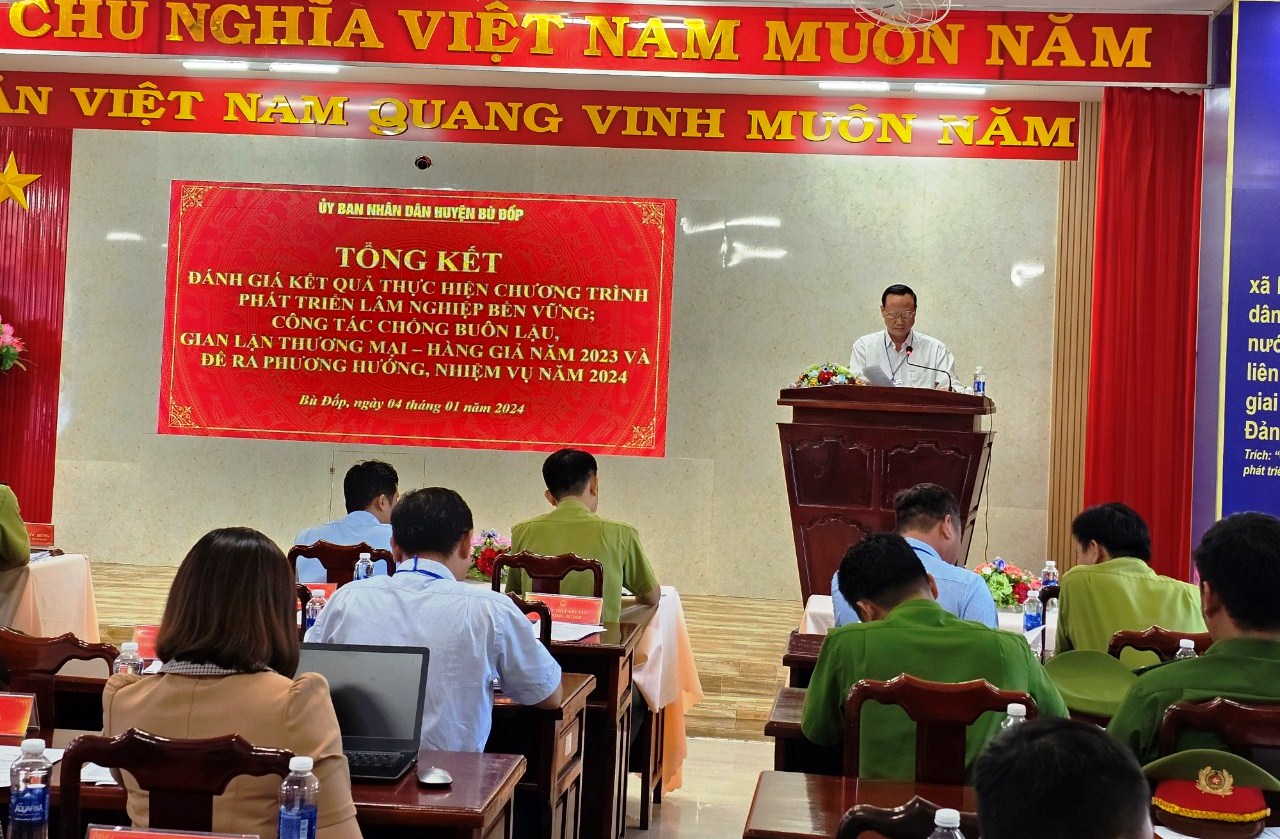 Sáng ngày 4-1-2024, Chủ tịch UBND huyện Bù Đốp Lê Quang Oanh chủ trì hội nghị tổng kết đánh giá kết quả thực hiện chương trình phát triển lâm nghiệp bền vững; công tác chống buôn lậu, gian lận thương mại – hàng giả năm 2023; triển khai phương hướng nhiệm vụ năm 2024. Dự hội nghị có Cục trưởng Chi cục kiểm lâm tỉnh Trần Quốc Hùng; các đồng chí là thành viên BCĐ huyện; đại diện lãnh đạo các đơn vị phòng ban; các xã thị trấn; các đồn biên phòng đóng chân trên địa bàn huyện.