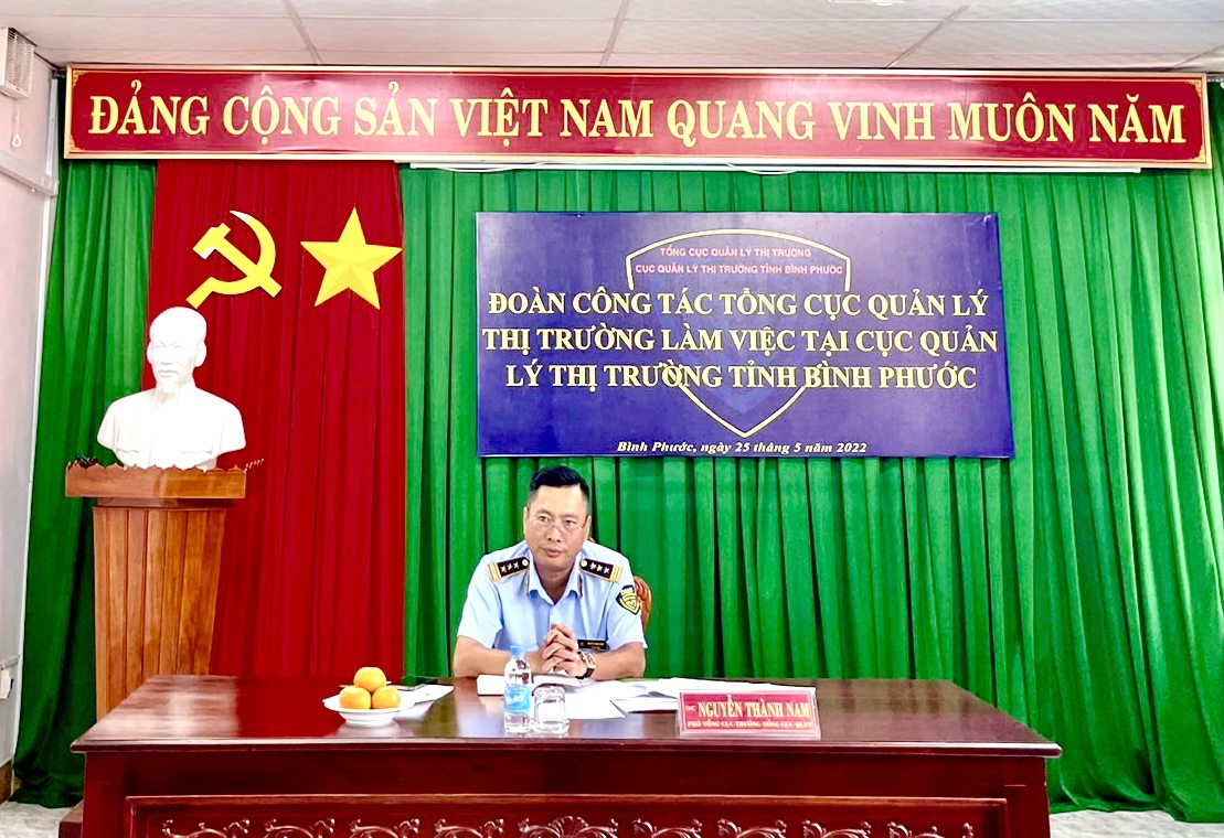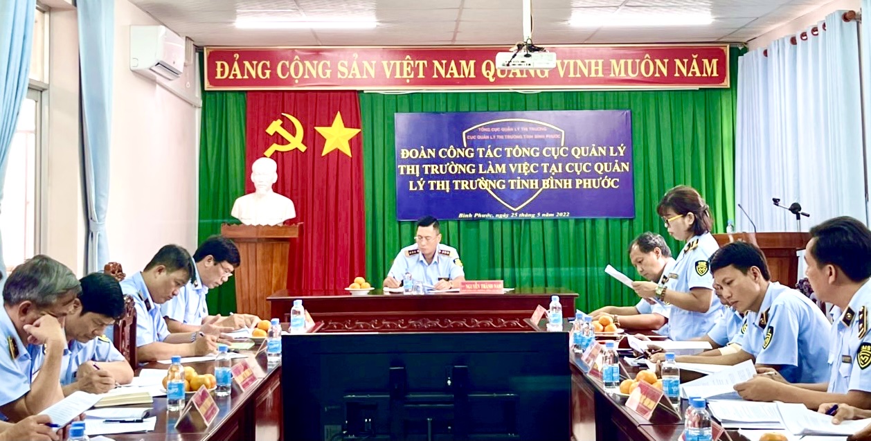 Ngày 25/5/2022, Đoàn công tác của Tổng cục Quản lý thị trường do Đồng chí Nguyễn Thành Nam - Phó Tổng cục trưởng làm Trưởng đoàn đã đến làm việc với Cục Quản lý thị trường tỉnh Bình Phước về tình hình kết quả hoạt động 4 tháng đầu năm 2022.