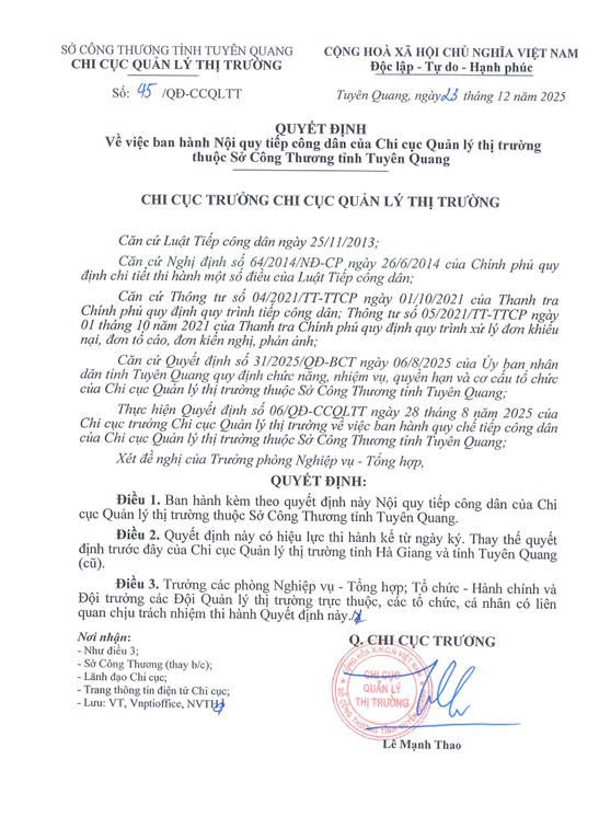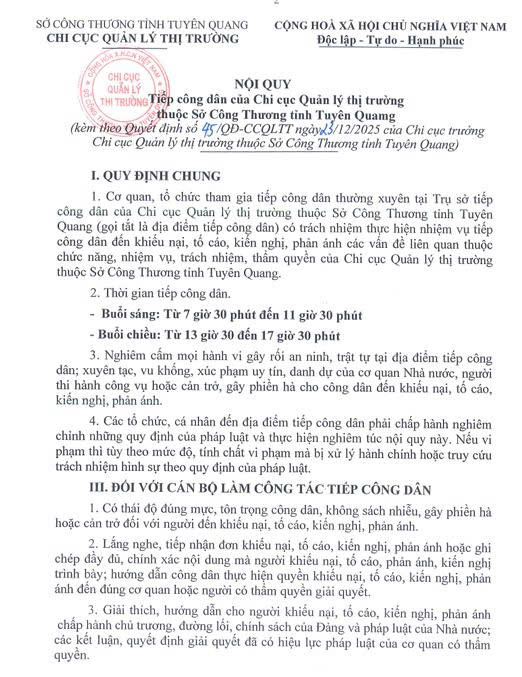 Quy chế tiếp công dân của Chi cục QLTT, Sở Công thương tỉnh Tuyên Quang